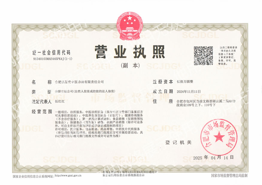 合肥弘愿堂中医诊所有限责任公司注册成立,注册资金50万元整,是合肥翰园健康管理有限公司的全资子公司。 弘愿堂坚守医者仁心,践行纯粹中医。弘愿堂坚信:医德是立身之本,疗效是信任之源。