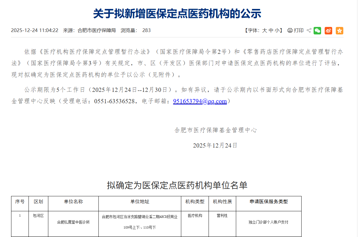 2025年12月24日,弘愿堂中医馆通过包河区定点医疗机构审查,对外公示,《关于拟新增医保定点医药机构的公示》